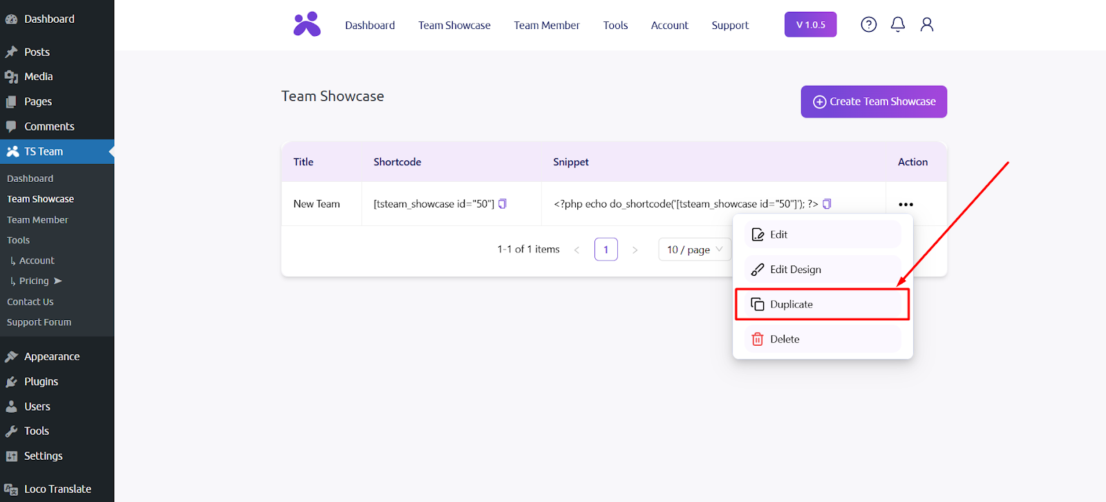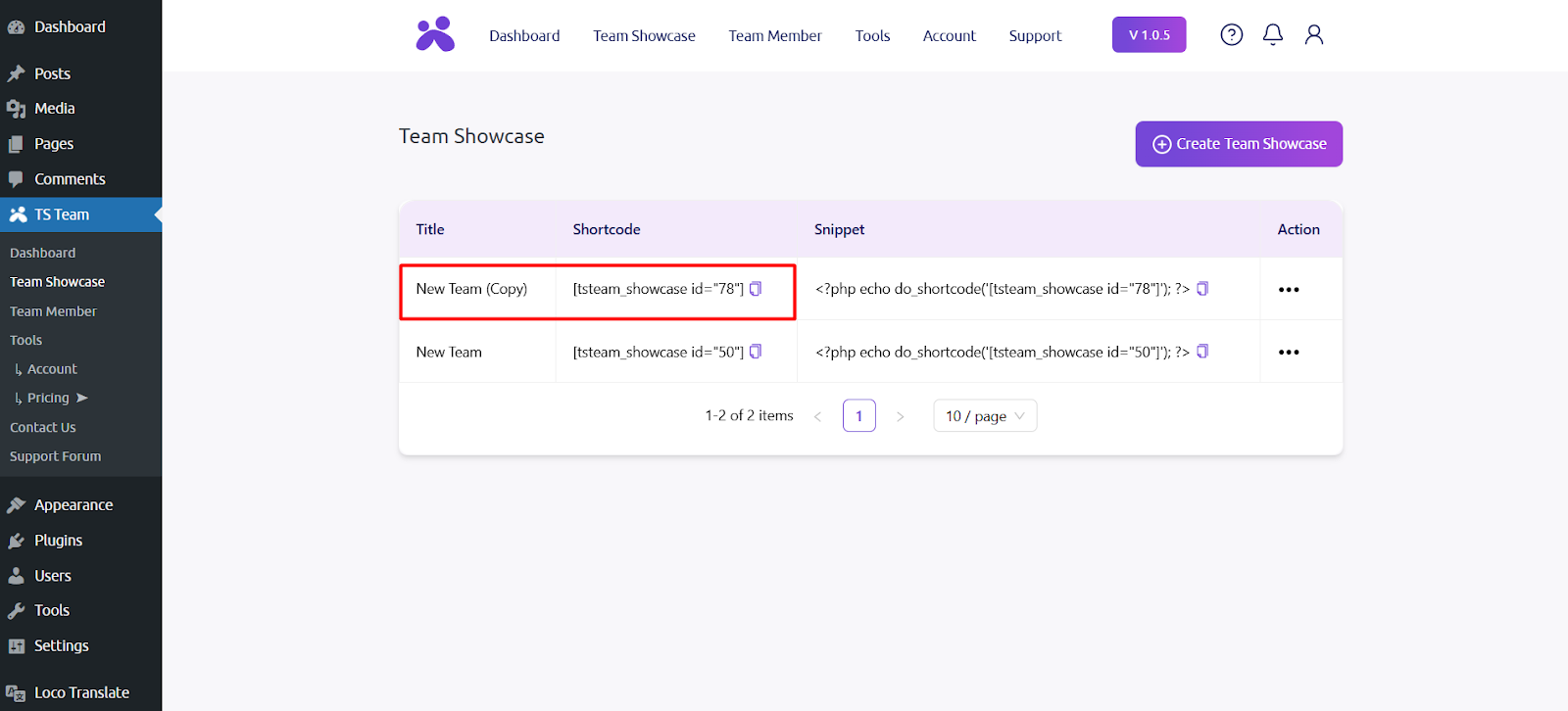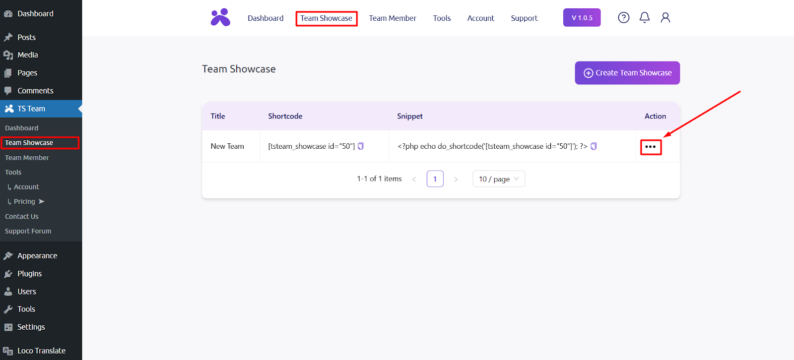 After activating the Free and Pro version TS Team plugin, go to the Team Showcase section and click on Action button.