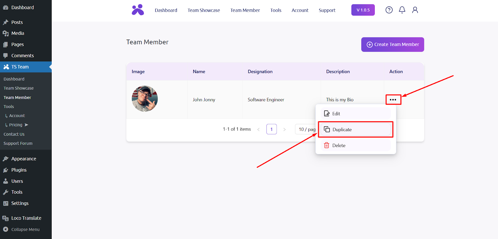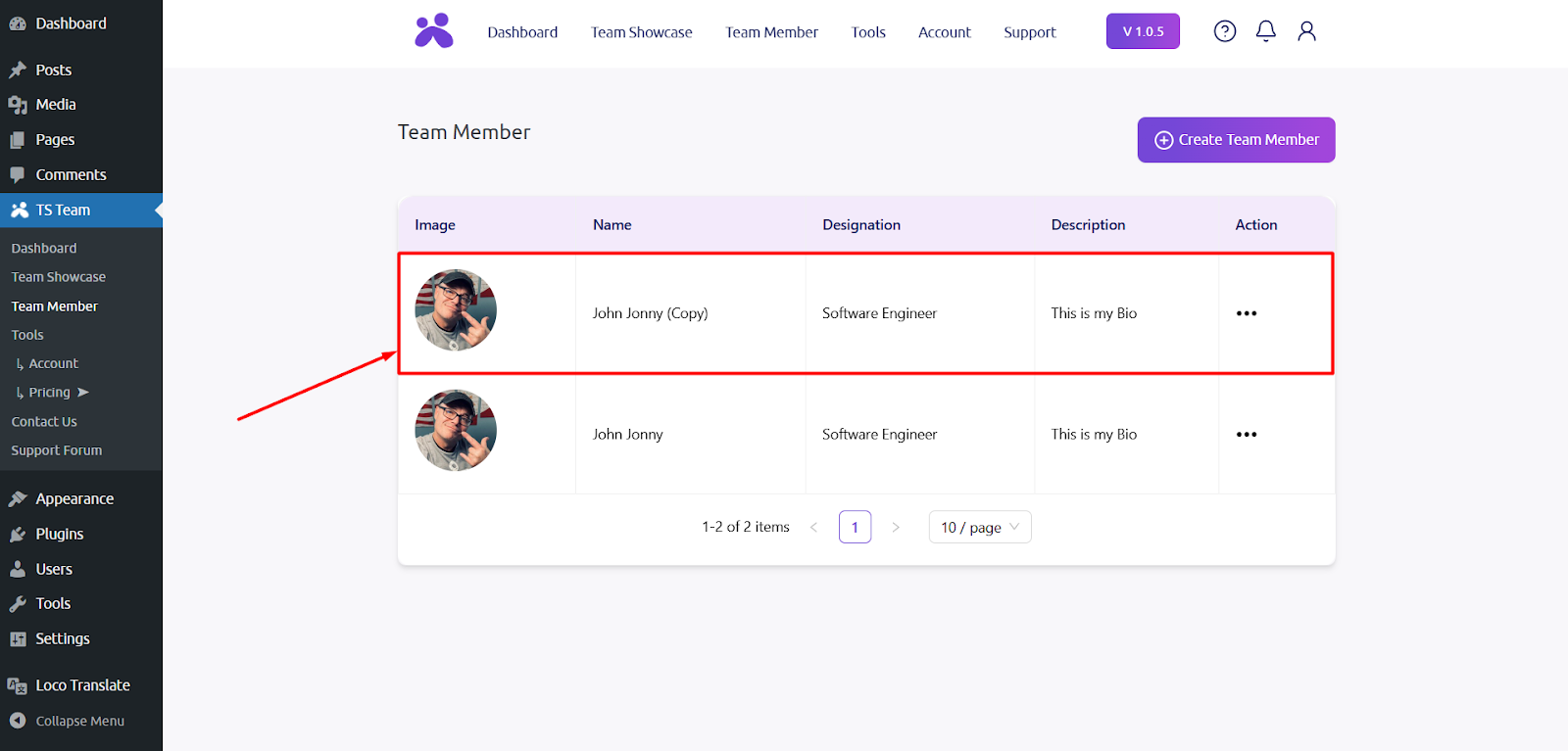 After activating the Free and Pro version TS Team plugin, go to the Team Member section and click on Action button.