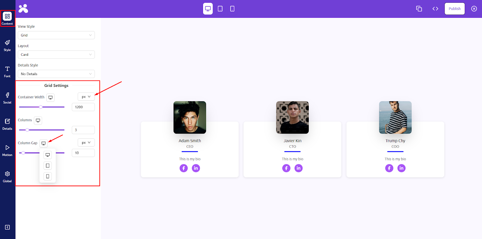 - View Style Settings: Fine-tune the visual spacing and behavior of your team layout. Adjust the width of the section, gaps between columns, and control how elements respond to hover interactions. These settings help adapt the layout to your any screen sizes.