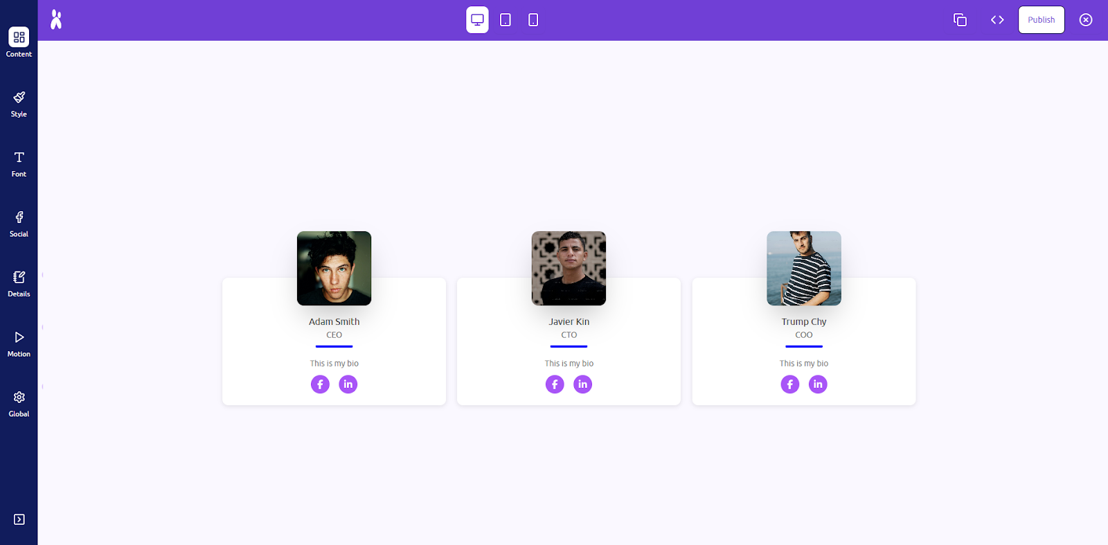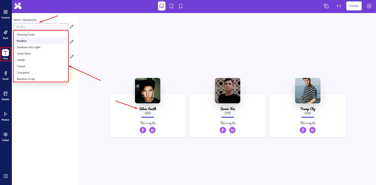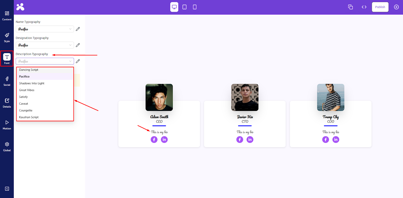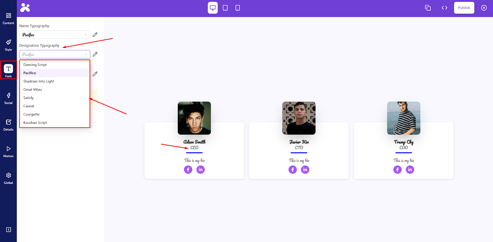 - Designation Typography: Select a specific font style for designations (roles) to differentiate them from names and ensure a clean visual hierarchy across team profiles.