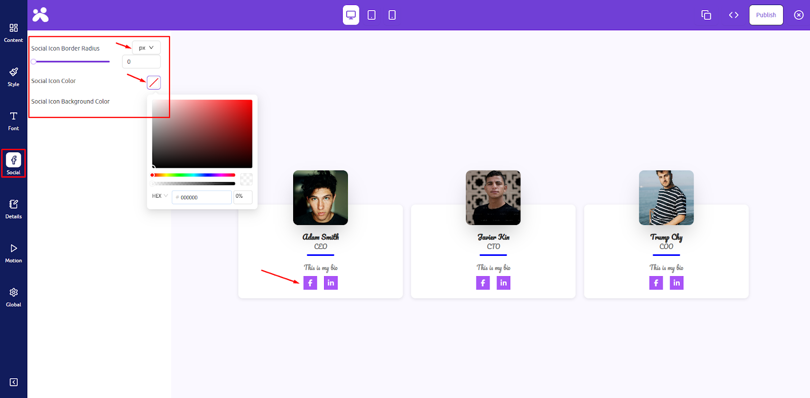 - Social Icon Color: Set the default color of the icons (like Facebook, Twitter, LinkedIn). This can reflect your brand’s color scheme or adapt to your site’s design aesthetics.