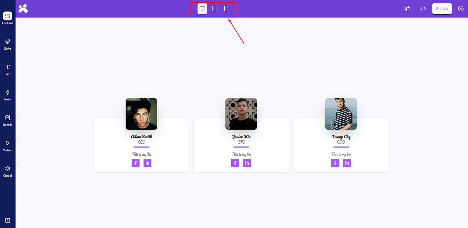- Before finalizing your showcase, it’s important to check how your design looks on different screen sizes to ensure the best user experience on all devices. In the Live Builder toolbar, switch between Laptop, Tablet, and Mobile view modes. This allows you to adjust column layout, font sizes, image scaling, or spacing specifically for each device. Ensure your text remains readable, images are well aligned, and hover effects function properly on all breakpoints.