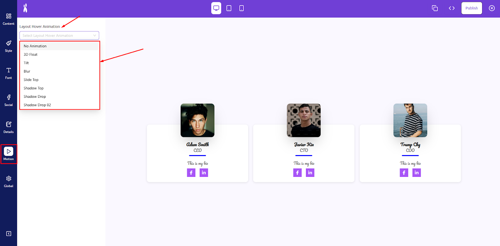 Add dynamic hover effects to your team cards for enhanced user engagement. Choose from animations like 3D Float, Tilt, Blur, Slide Top, Shadow Top, and more to make your layout interactive and modern.