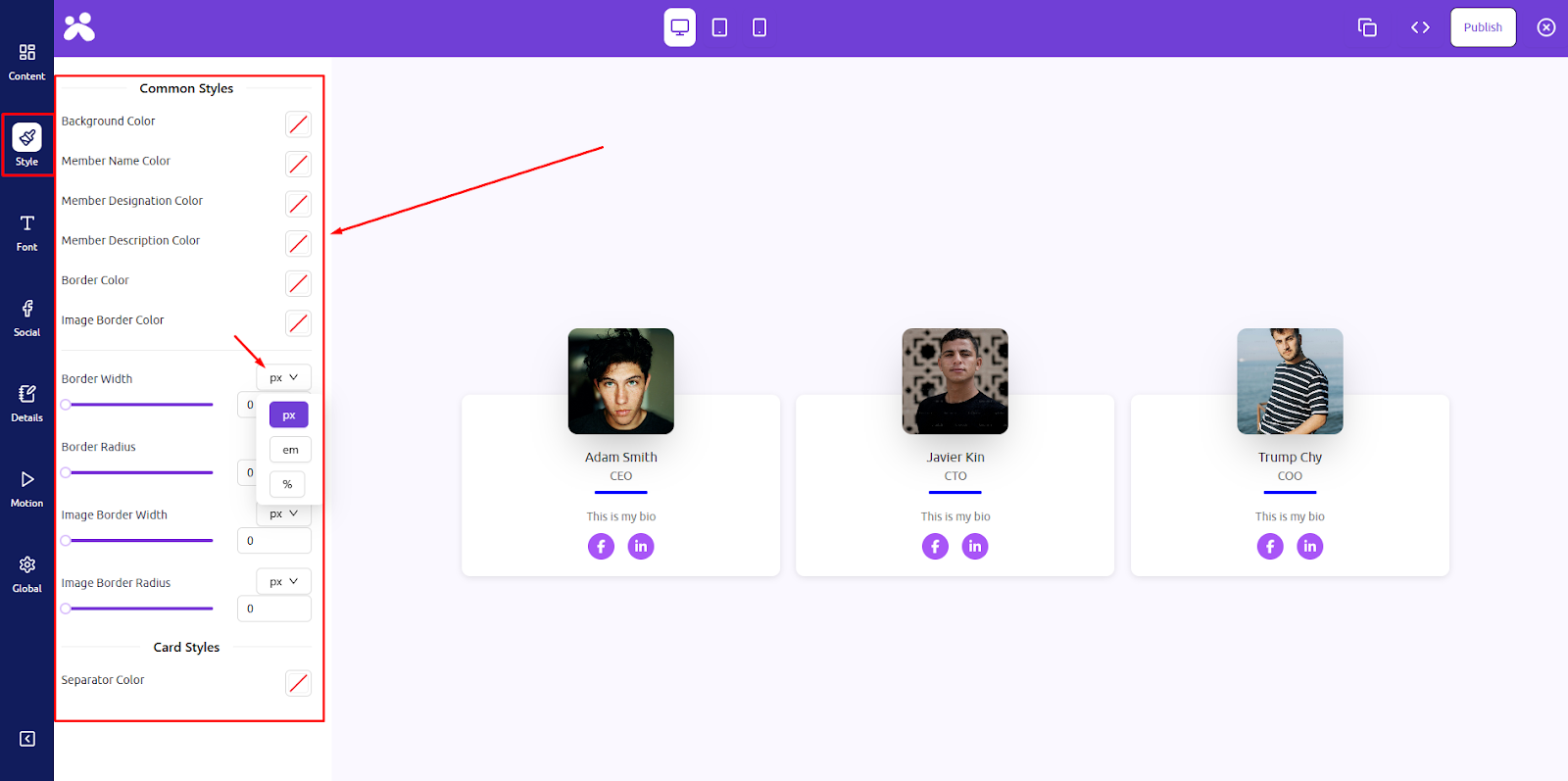 - Container Border Radius: Set the corner roundness for the entire container section. This adds a soft, modern touch to the overall team showcase block.
