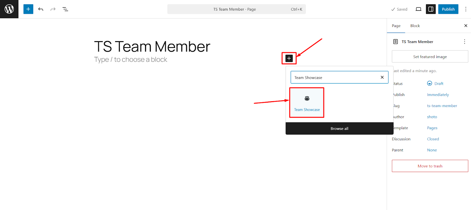 - To add TS Team Showcase block, search “Team Showcase” or scroll down to the Block Inserter section.