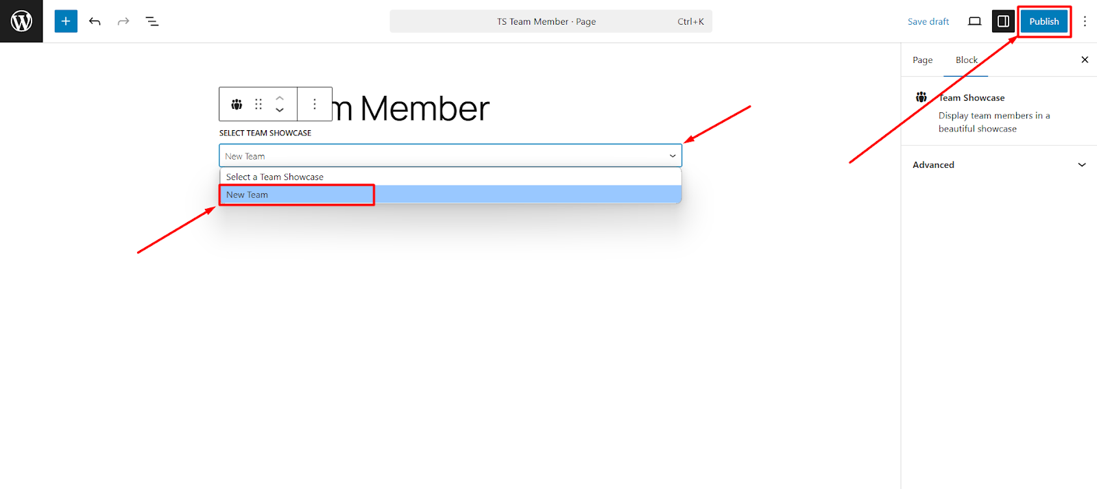 - Once you click the Team Showcase block, it will be added to the editor.
